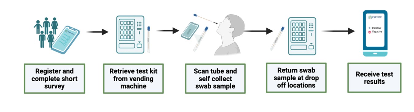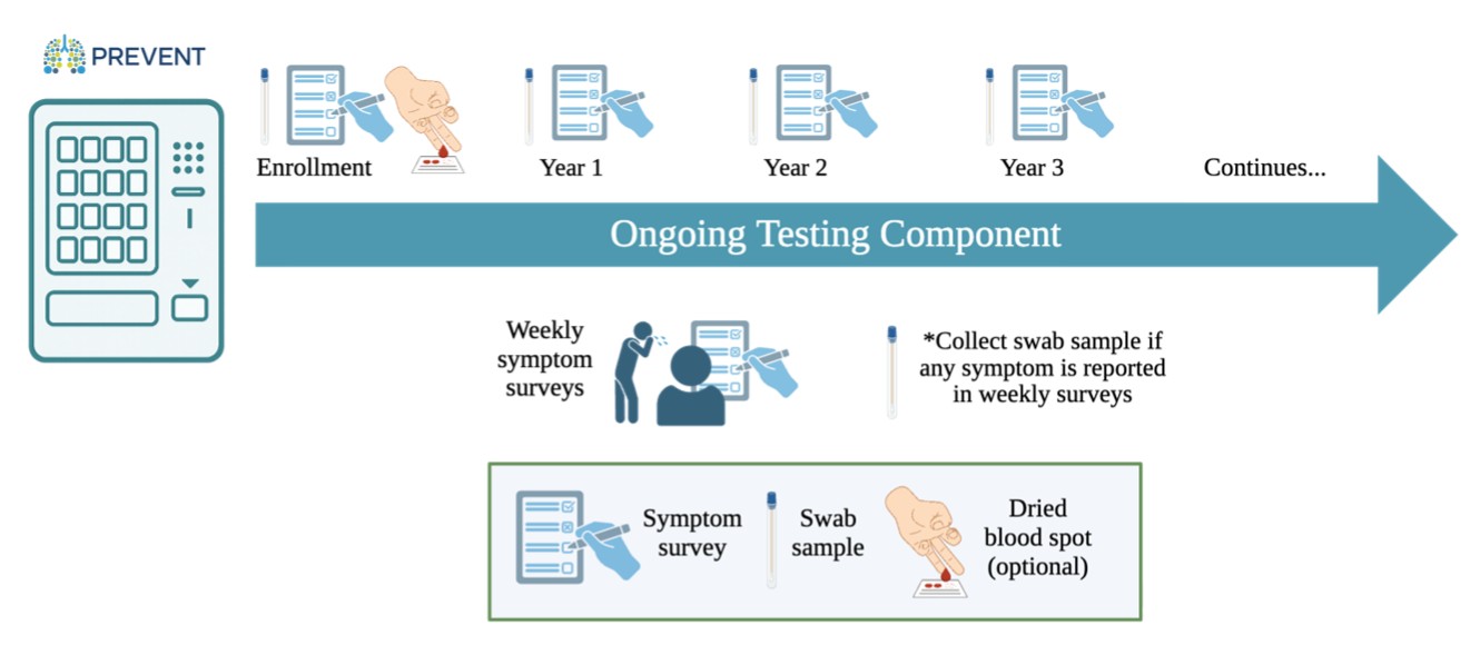 - At enrollment you will be invited to provide a ‘baseline’ nasal swab to make sure it is easy for you to use the PREVENT website app to request a testing kit, retrieve a testing kit from a vending machine, self-collect a sample, and return the sample for PCR testing. You will also be invited to provide a dried blood spot.