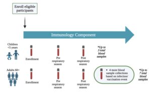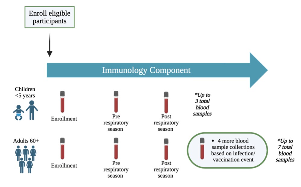 - Blood and saliva and/or nasal fluid samples at enrollment and each year before and after each respiratory season